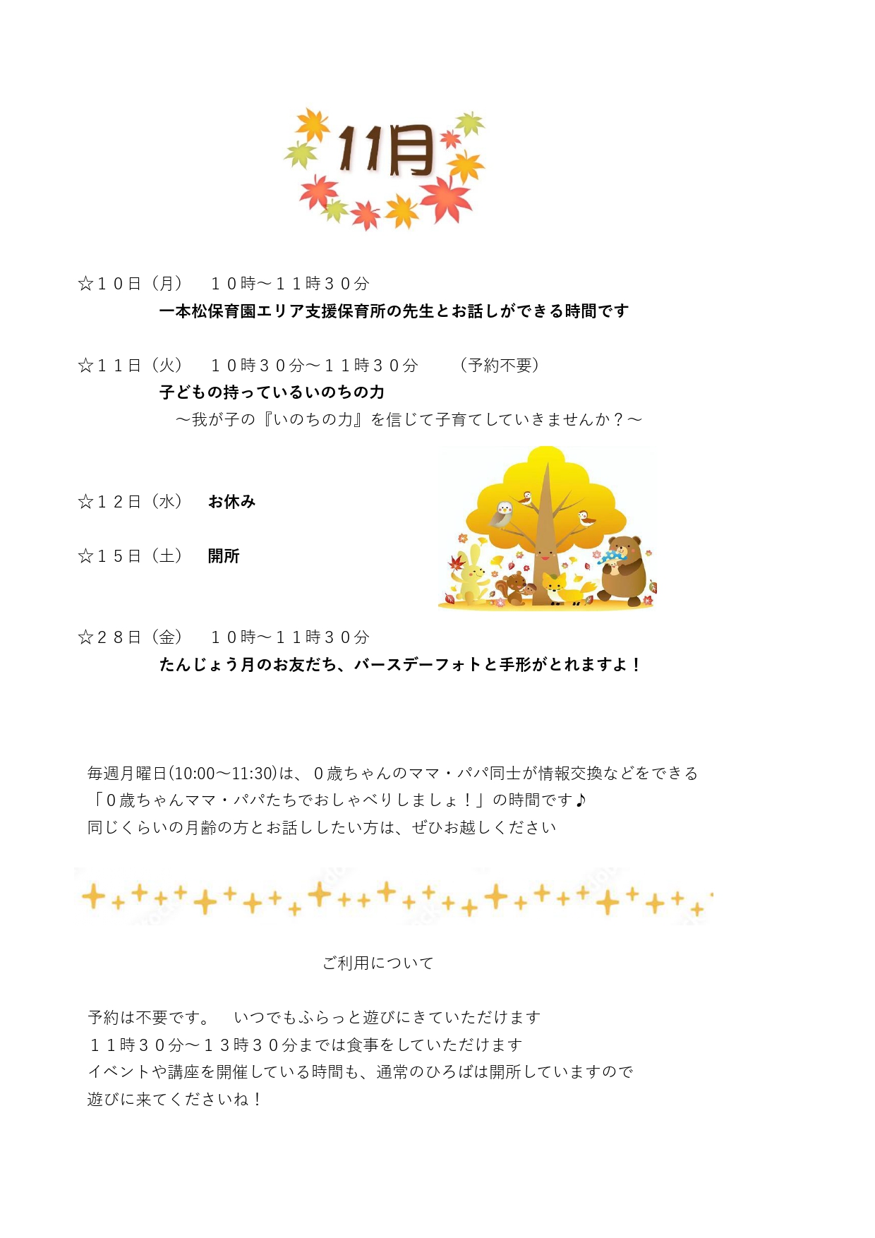 こんにちは♪ いまの季節「寒暖差疲労」という言葉があるそうですね 昼夜の気温差で体調くずされてたりしませんか? 秋晴れのお天気の日には、お散歩したりひろばで遊んだり リフレッシュしながら心身バランスよく過ごせますように♪ …