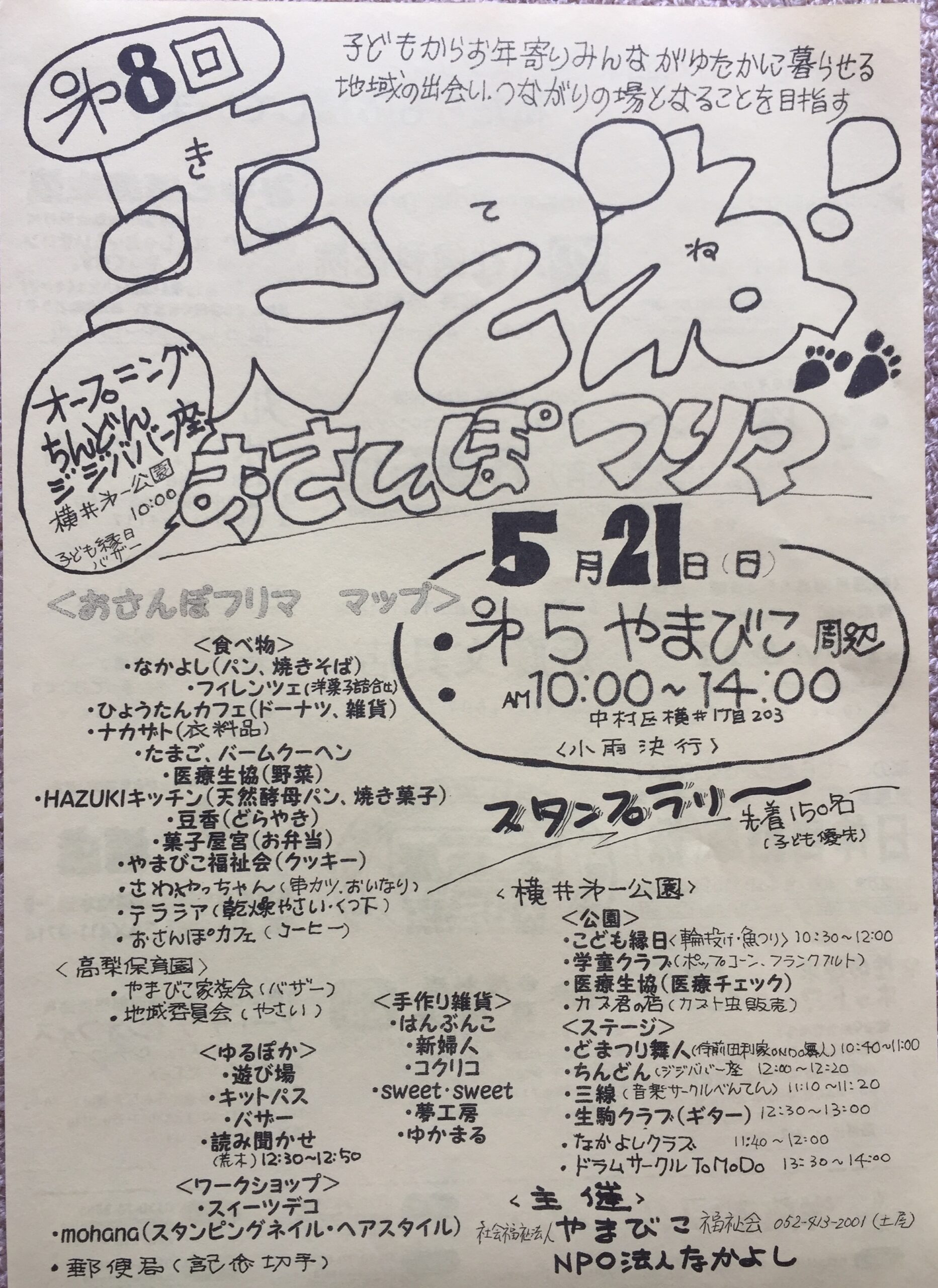 こんにちは! 毎年、地域で年2回やっている 「おさんぽフリマ」のお知らせです。 今回で、第8回目となります(^.^) 5/21(日) 10時〜14時 第5やまびこ周辺〜横井第一公園あたりが おさんぽフリマ通 …
