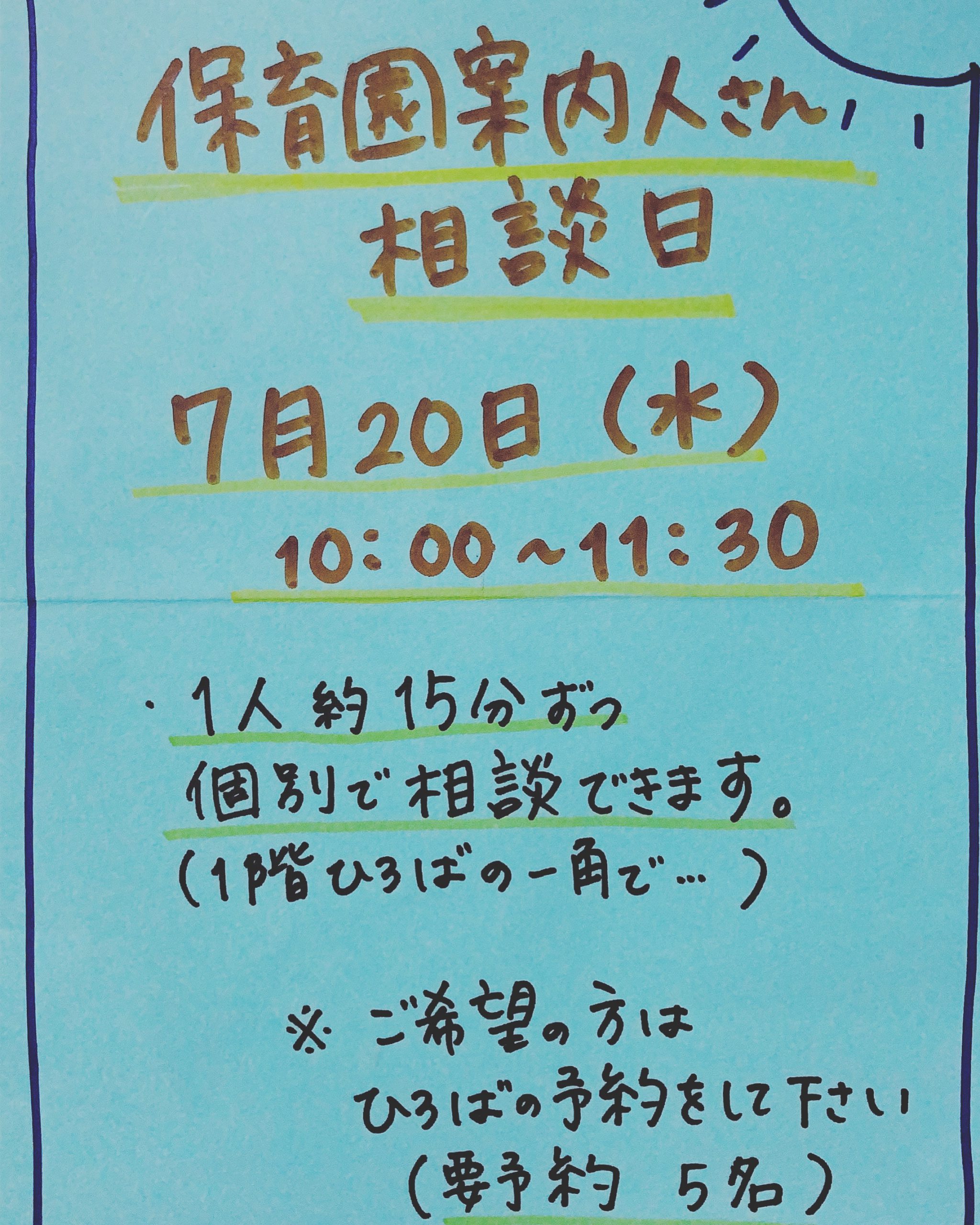 保育園案内人さんが 来てくれます^_^ 保育園に関しての疑問など 個別に相談できます。 広場を予約してご参加下さいね♪ その他ご不明な点がございましたら スタッフまでお問い合わせください。 ゆるぽか 052-412-70 …