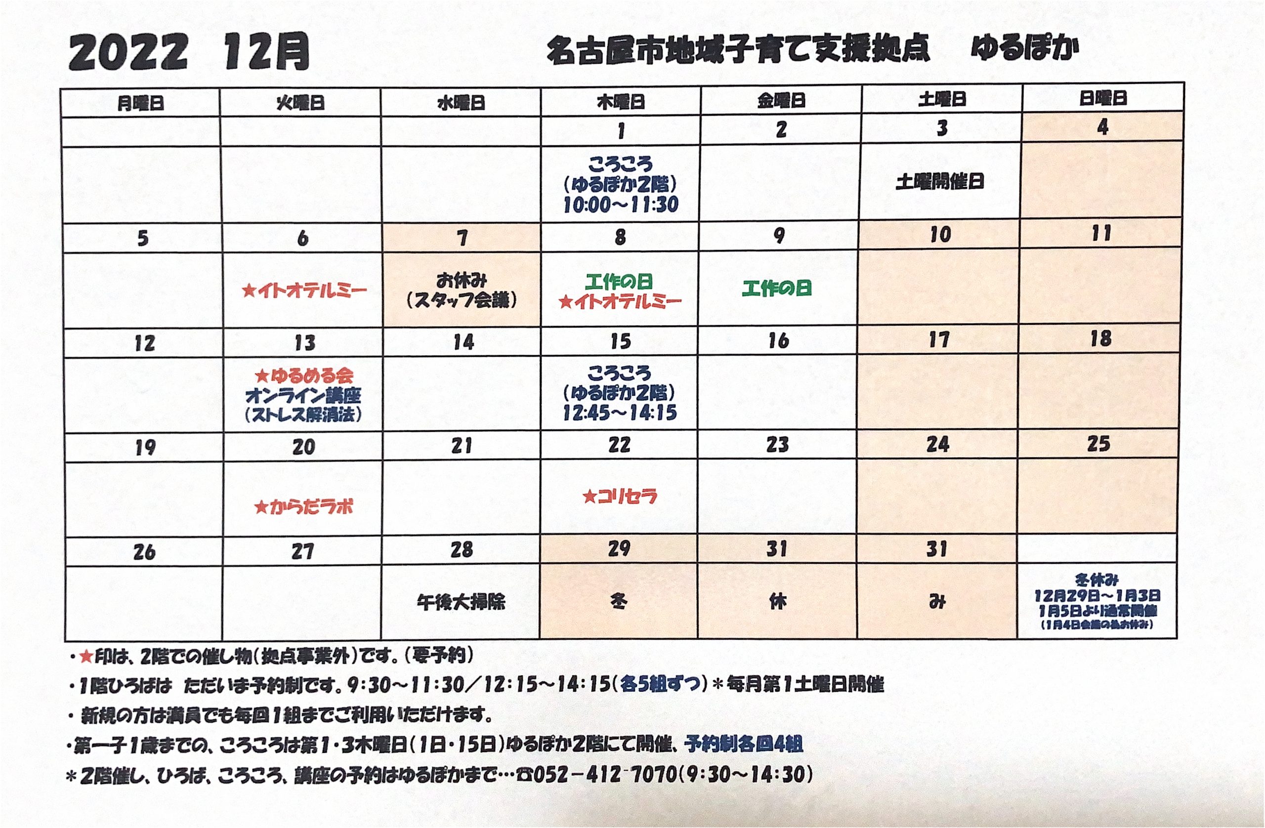 ゆるぽか12月の予定です。 今年も残りわずか。 ママもパパも、お子さんも 体調の変化に気をつけて 元気に過ごせますように^_^ ゆるぽかのホットカーペットで ぽかぽかしながら ゆっくりのんびり遊んでください …