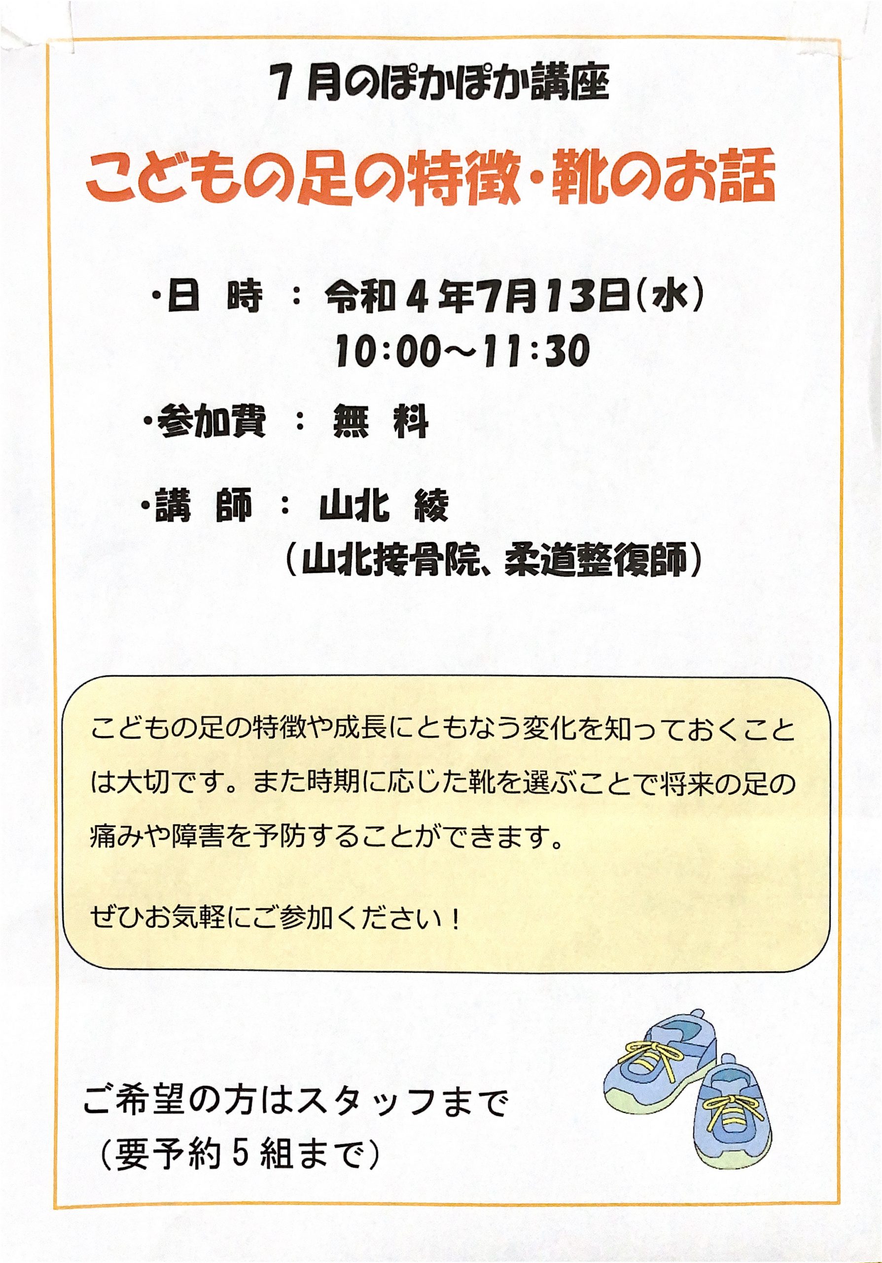 7月のぽかぽか講座の お知らせです。 お子さんの足に合うくつの 選び方や、子どもの足の特徴など のお話。 一階のひろばで 親子一緒に参加になります。 参加希望の方は 広場を予約してくださいね^_^ ゆるぽか 052-41 …