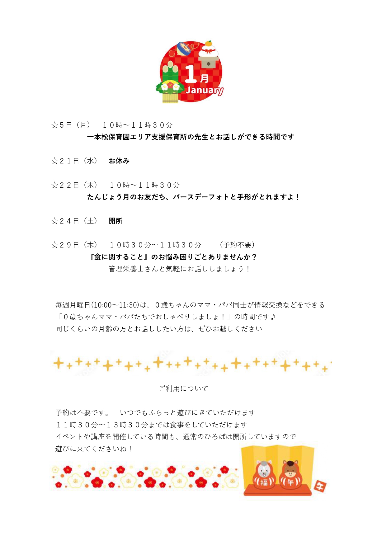 こんにちは♪ 一年間たくさんの方にご利用いただきありがとうございました。 お子さんの成長を一緒に見守らせていただけたこと とても嬉しく思っています。 ひろばで遊ぶのはもちろん 休みない育児に不安だったり、時 …