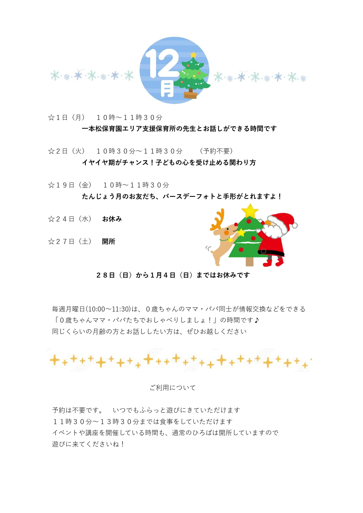 こんにちは 今年も残りわずかとなりました。 寒さも本格的になりインフルエンザの流行など 体調を崩されたりしていませんか? きゃらでは手洗いのご協力や、ひろばの換気、おもちゃの消毒など より気を付けていきたいと思っています …