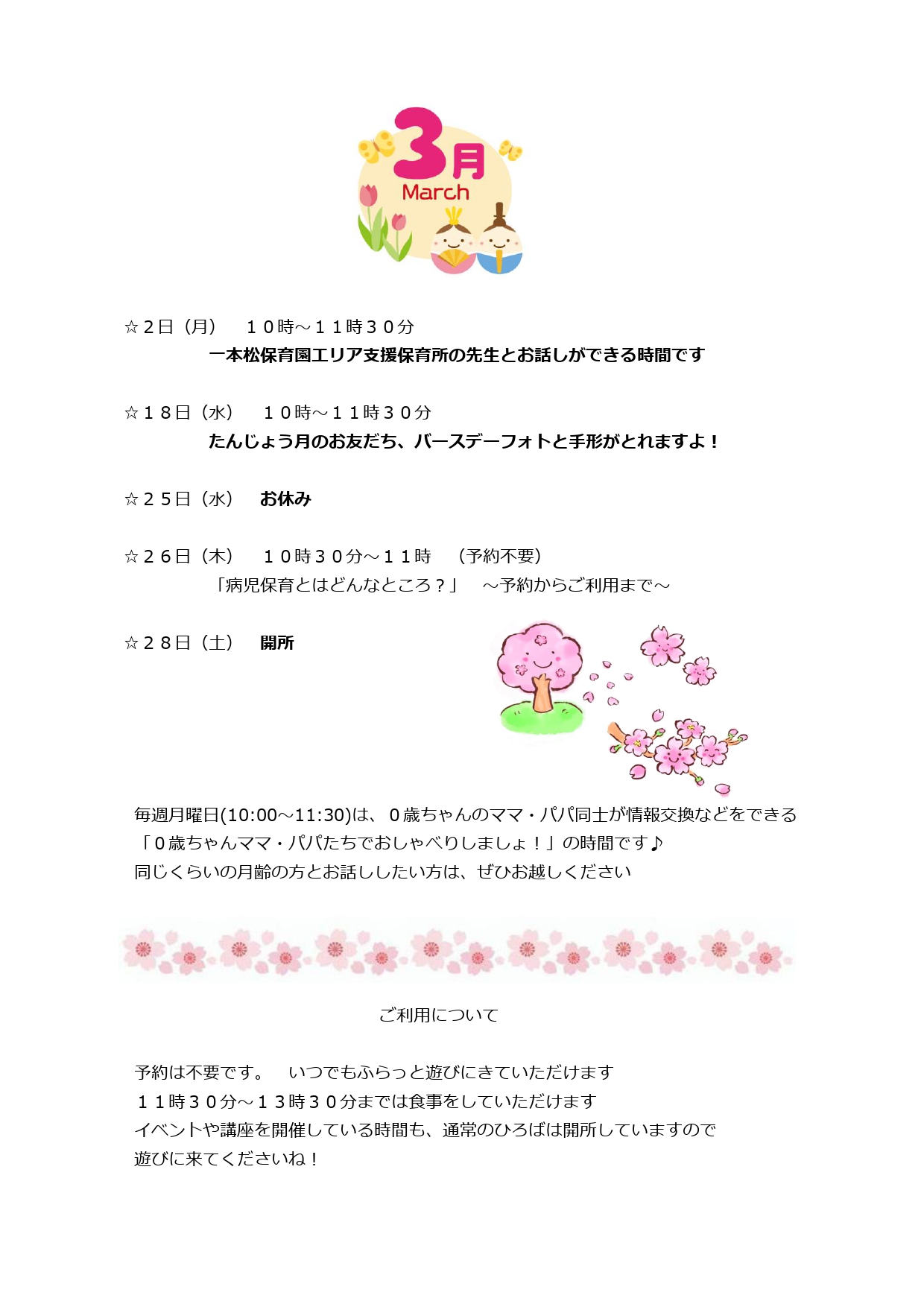 こんにちは! 少しずつ暖かい日も増え、春の訪れを少しづつ感じる季節ですね♪ 植田公園で遊ぶ子たちの姿も増えてきました! 砂場やブランコで遊んだり ヨチヨチお散歩したり、走り回ったり 外って楽しい! きゃらのお部屋でゆっく …