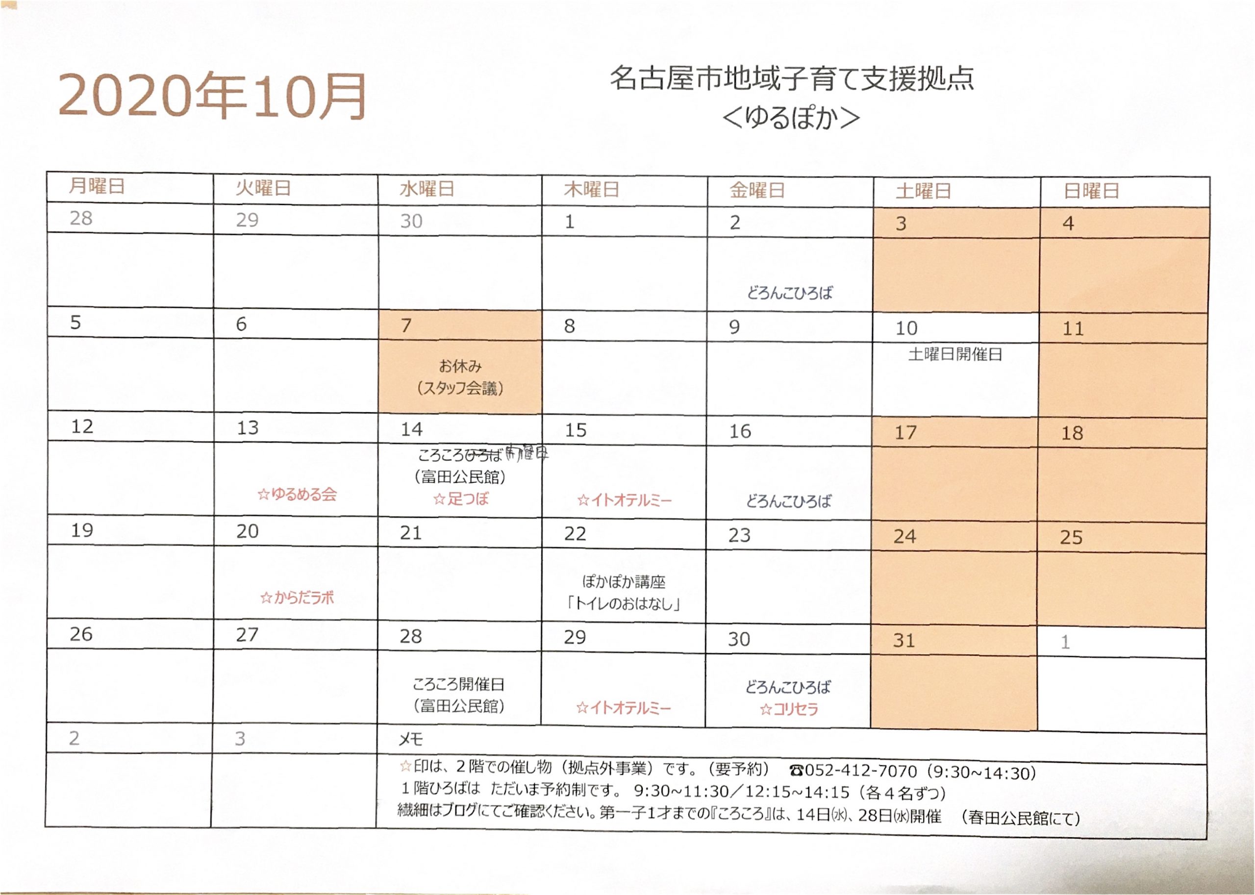 ☆1階 ひろばの予定 (9:30〜11:30 12:15〜14:15 各4組予約制) 7(水) お休み (スタッフ会議のため) 10(土) 土曜日開催日 22(木) ぽかぽか講座 「トイレのおはなし」 ☆2階 催し物 ( …