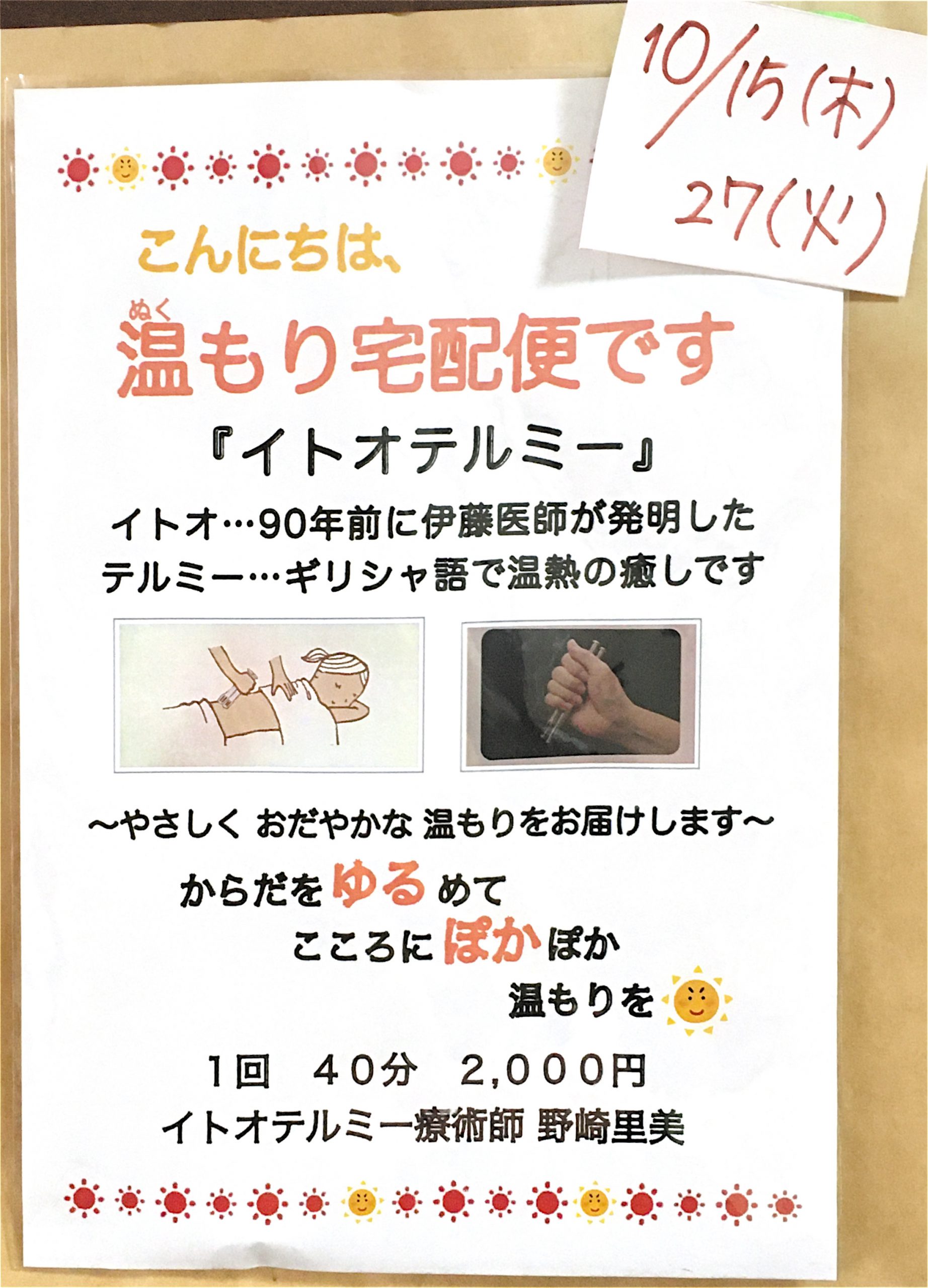 10月のイトオテルミーの開催日が カレンダーでは 10月29日になっていましたが 10月27日の開催ですので 訂正させて頂きます。 イトオテルミー 11月からは1500円での施術となります。 お体、ゆるめたい方、お待ちし …