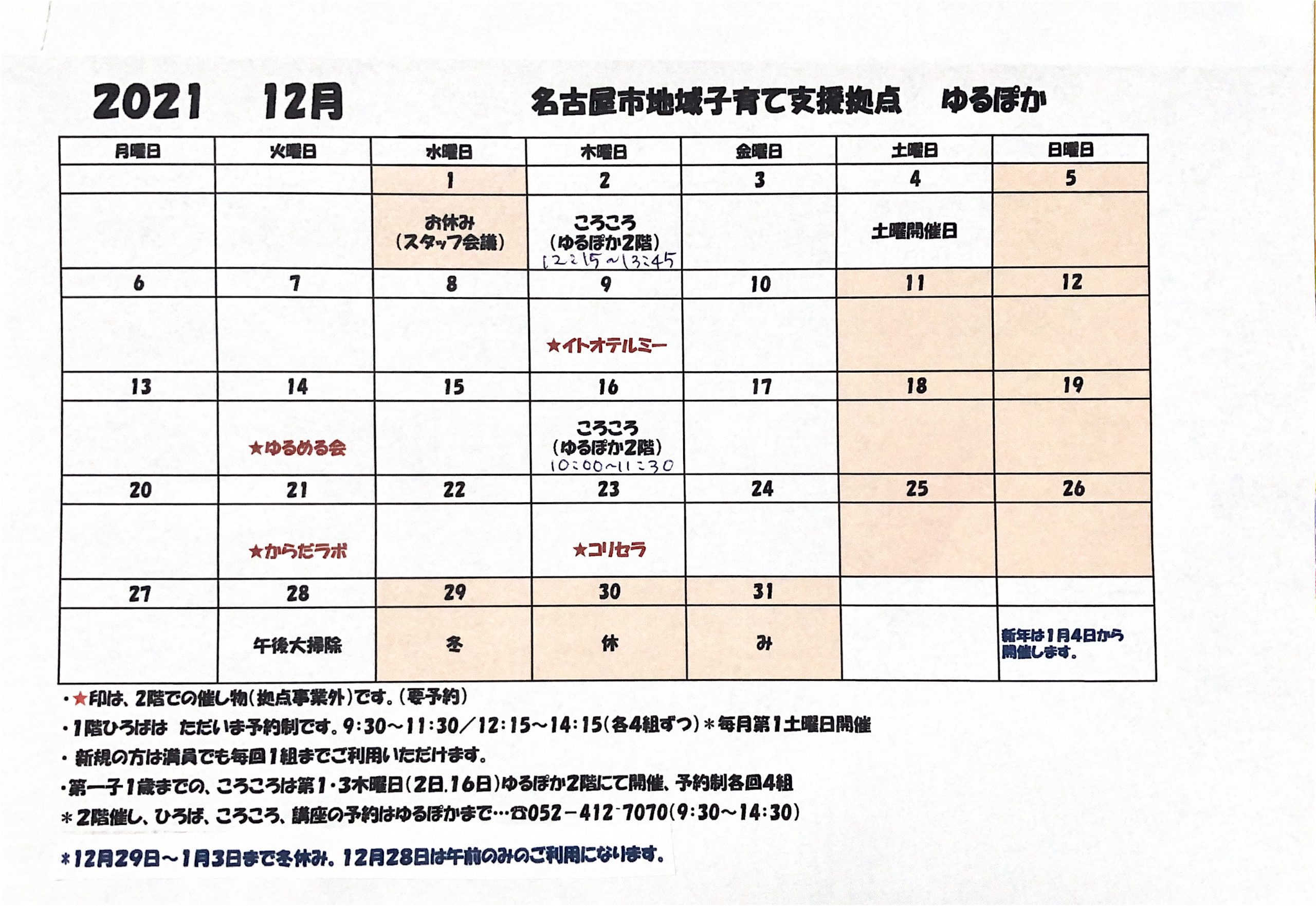 1月の予定です。 2021年もあと僅かとなりました。 どんな1年だったでしょうか? ゆるぽかは コロナ禍でしたが 感染対策に気をつけながら 開催し 沢山の親子さんと笑顔で 過ごすことができました。 緊急事態宣言が明けてか …