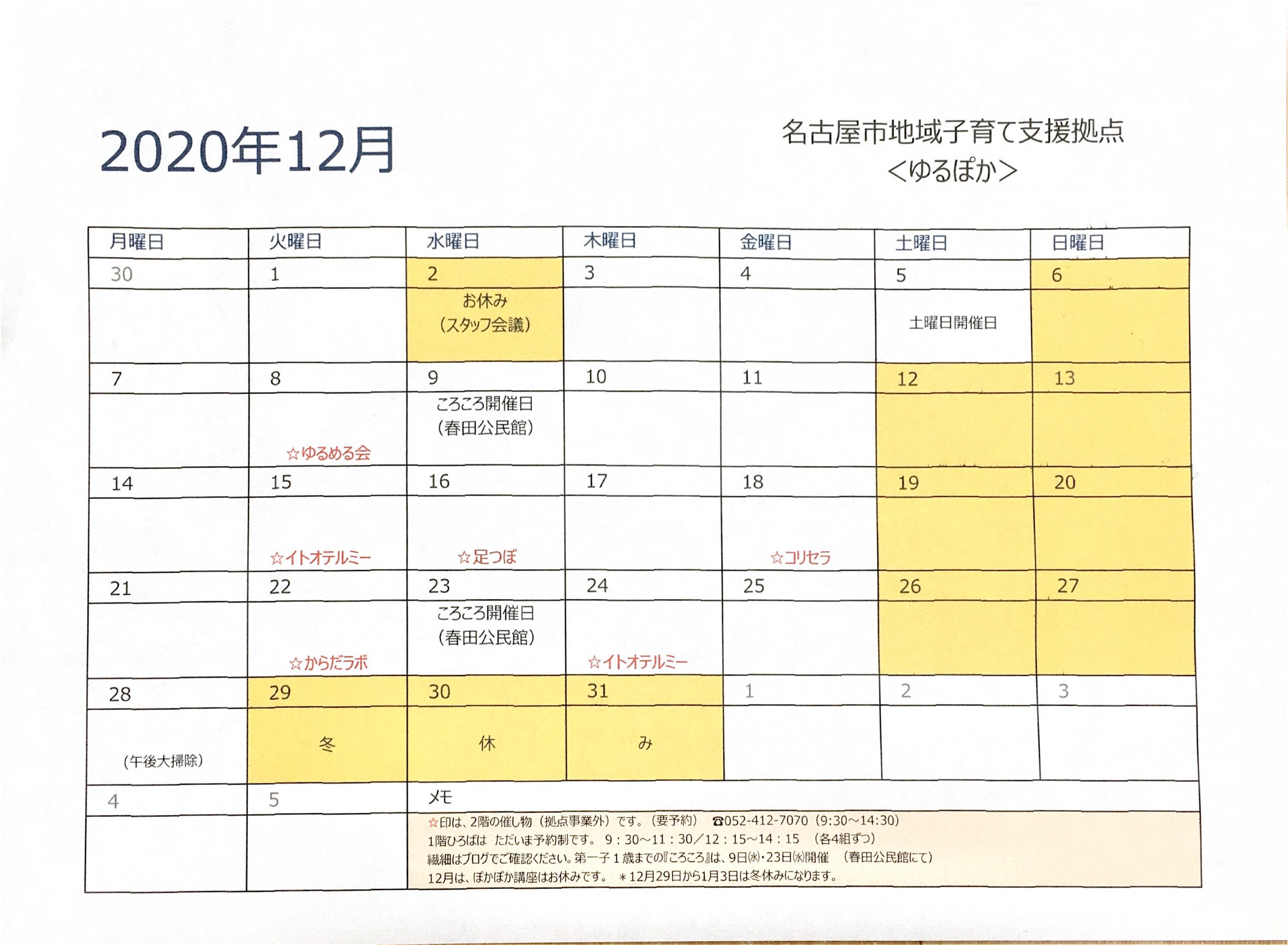 ☆1階 ひろばの予定 (9:30〜11:30 12:15〜14:15 各4組予約制) 2(水) お休み (スタッフ会議のため) 5(土) 土曜日開催日 年末年始のお休み 12月29日(火)〜1月3日(日) ☆2階 催し物 …